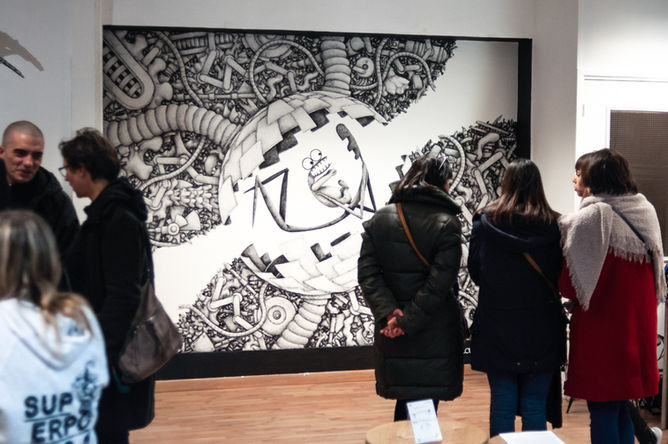 Mani en pleine création de la Fresque sur le mur de la Galerie Superposition, durant l’exposition “La Mécanique du Vide” à Lyon, en Février 2019.